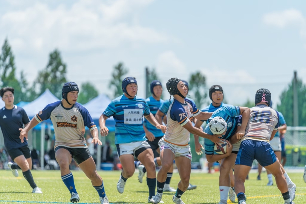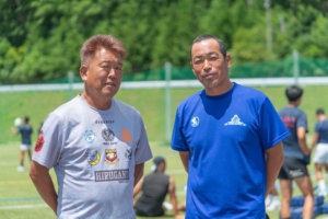 菅平高原での合宿の前の慣らし練習として、試合形式での練習をしています。夏休みに入ると色んな大会があってチーム全体が揃うことがなかなかないのですが、郡上市の合宿は、夏に初めてチーム全体で練習ができる場になっています。冬の花園に向けて、下半期のスタートを切るイメージでやっています。